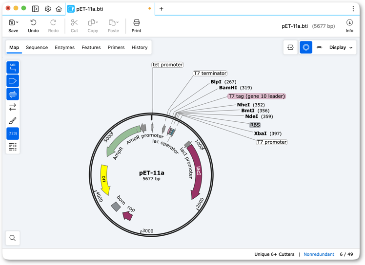 SnapGene can read .bti files created by GeneTool. Shown below is an example of a GeneTool file viewed with the original program and with SnapGene.