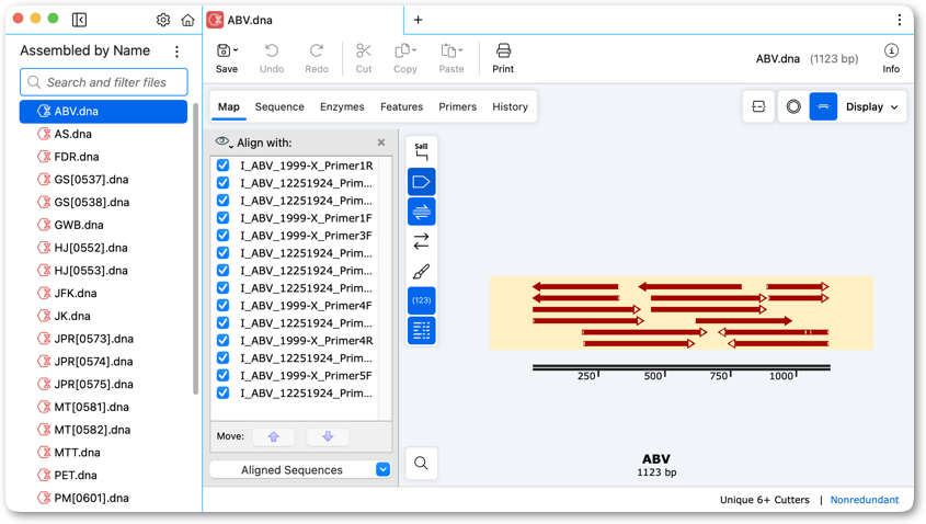 The same Sequencher project and assembly overview when viewed within SnapGene: