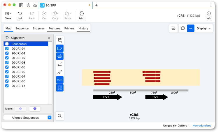 A Sequencher Map to Reference assembly project when viewed within Sequencher: